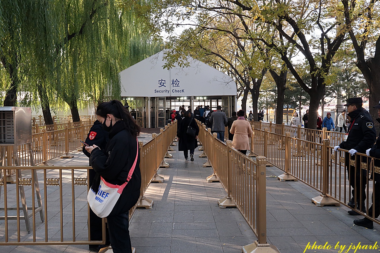여기서 또 검문검색이다. 그렇지 않아도 사람이 많은데 이래서 줄이 더 길고 줄지 않는다. 여기서는 더 까다롭다. 여권 복사본을 제시했더니 내 사진을 다시 찍는다. 생수도 가지고 들어갈 수 없다고 버리란다. 박물관에 들어가는 것인지 맞은편 인민대회당(人民大會堂)에 들어가는 건지 헷갈려진다. 아니지. 예전에 인민대회당에 들어갔을 때도 이 정도는 아니었다.